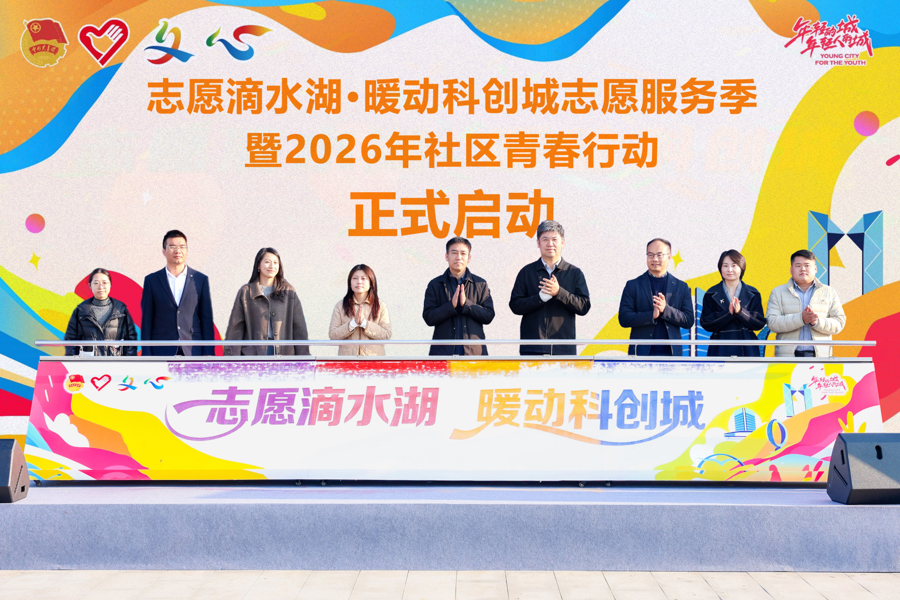 临港新片区管委会二级巡视员、机关党委书记严亦军,南汇新城镇党委副书记、镇长孙筱和,上海青年志愿者协会副秘书长任彦与临港五校团委、上海市卫生健康委团委代表共同推动启动拉杆,正式启动“志愿滴水湖·暖动科创城”志愿服务季暨2026年社区青春行动。这标志着临港新片区青年志愿服务事业迈向系统化、品牌化的新阶段,将全面推动青年力量深入参与基层治理和社会服务。